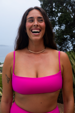 Déborah porte le top brassière Felixia Rose fuschia en taille XL. Elle porte du 95D ou 90E. Prendre votre taille habituelle, ce modèle taille normalement.